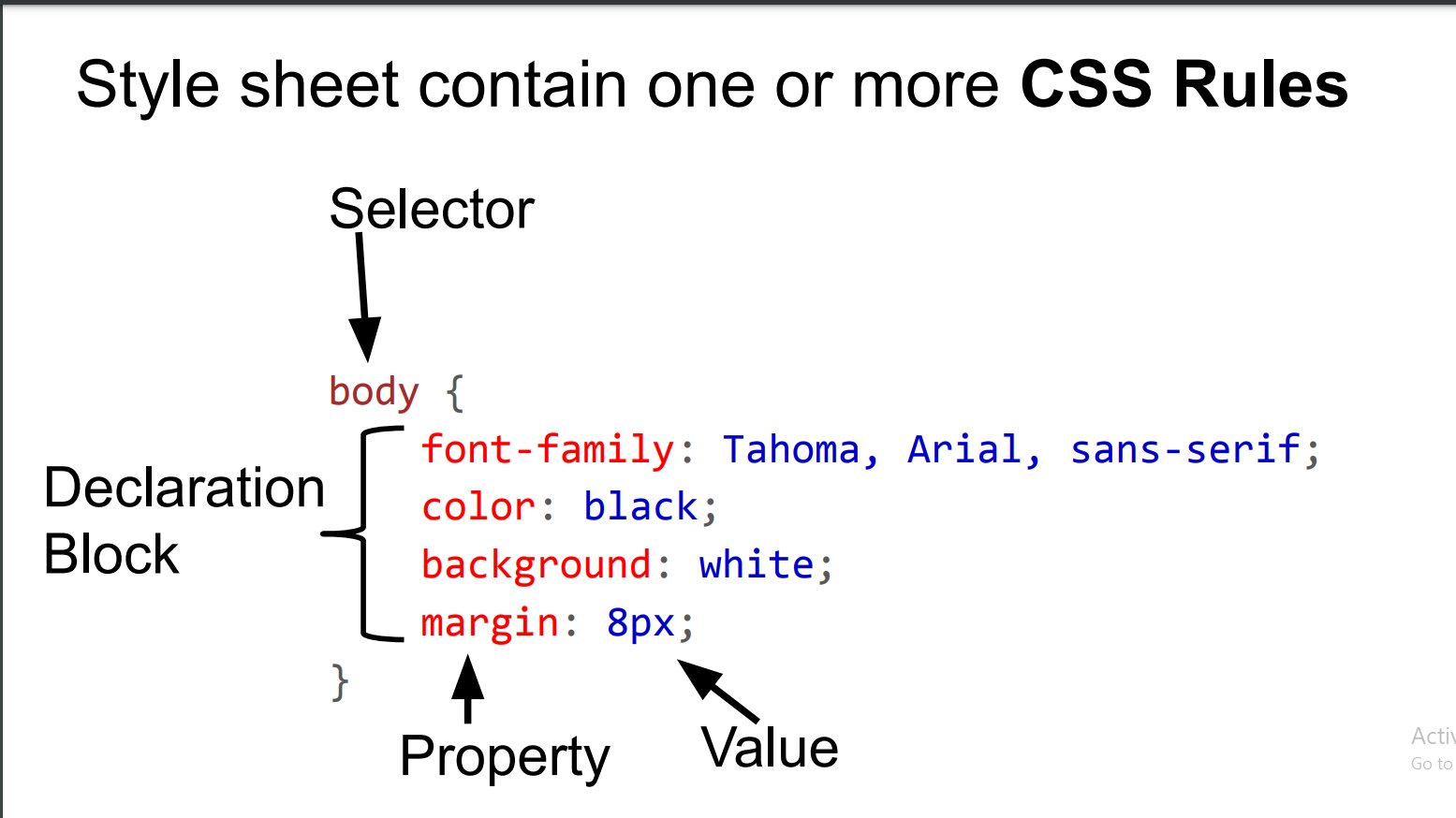 A style sheet consists of a list of rules. Each rule or rule-set consists of one or more selectors, and a declaration block.